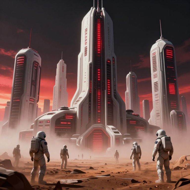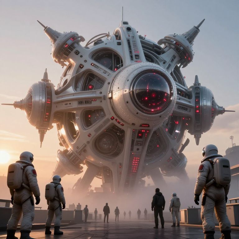 CGI sci-fi scene: Five astronauts in white space suits face a massive, futuristic, spherical spaceship with large, circular sensors and red lights, set