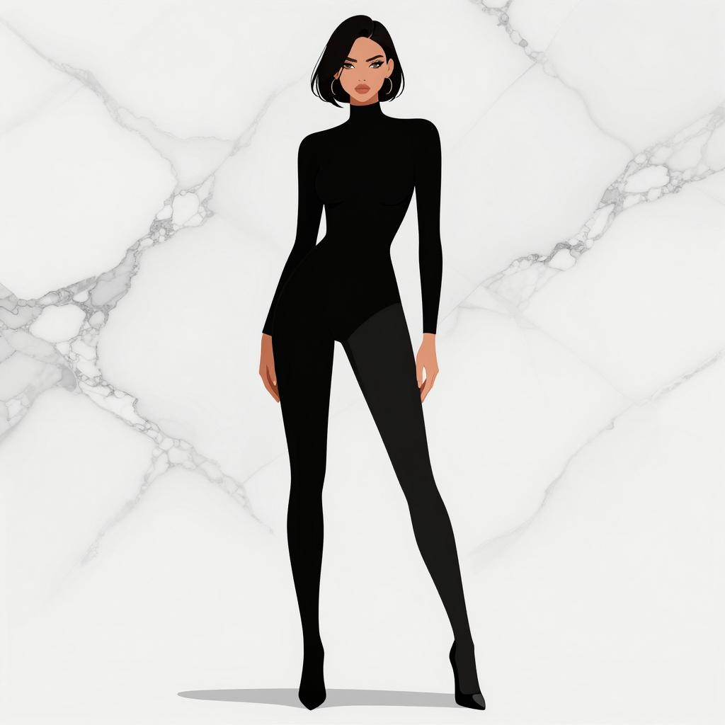 Illustration of a confident woman wearing a sleek, form-fitting black outfit with long sleeves and high neck, standing against a white marble background. The figure has short black hair and is accessorized with hoop earrings, embodying modern high-fashion style.