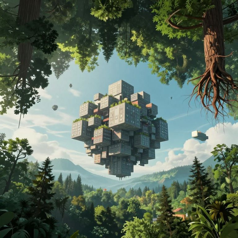Digital artwork of a floating, cube-shaped city amidst a dense, lush forest with towering trees, clear blue sky, and distant mountains.