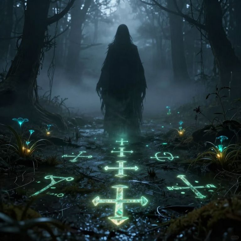 Deoth depicted as a shadowy ethereal spirit emerging from a fog-covered swamp, glowing symbols etched into the ground, cinematic fantasy style, dark moody palette with highlights from bioluminescent flora