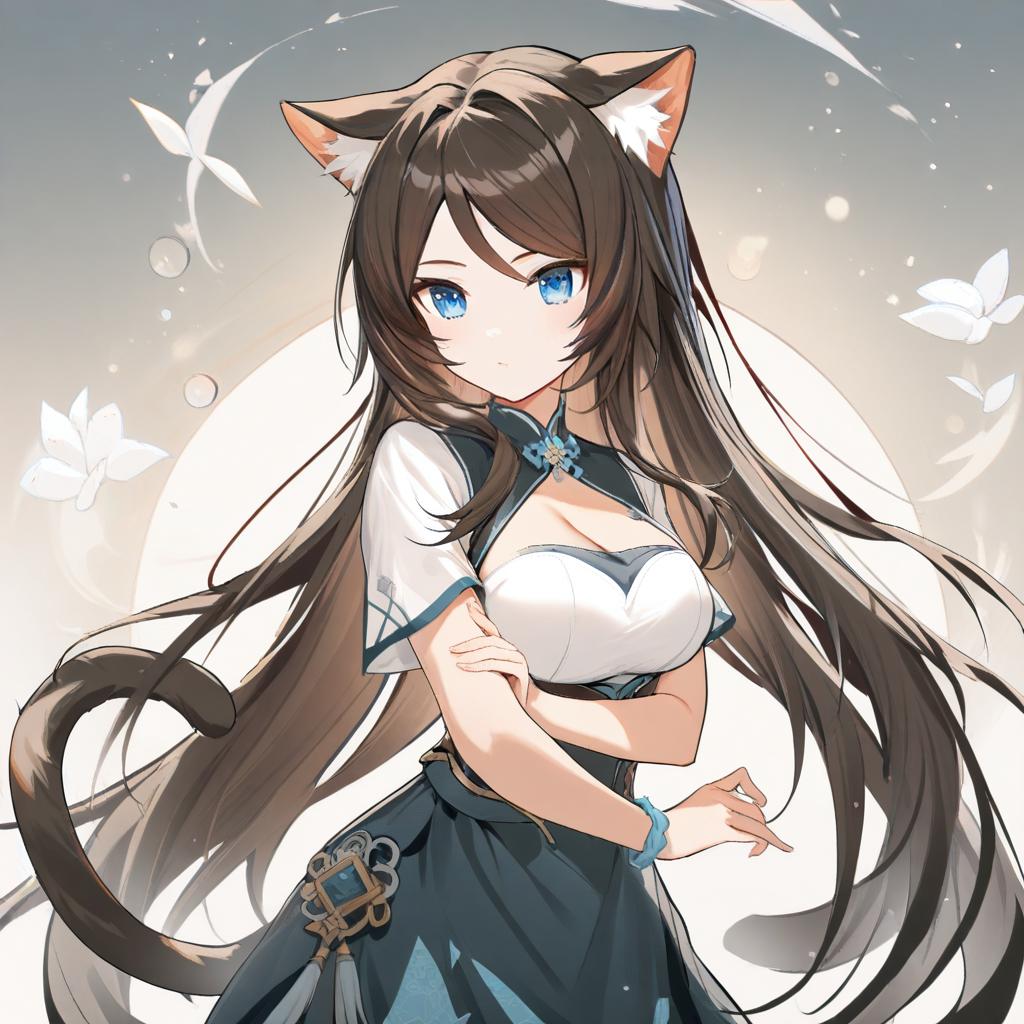 Aina (mao lian), original, 1girl, cat ears, cat tail, animal ear fluff, blue eyes, brown hair, long hair, black hair, very long hair, medium breasts, cleavage, by artist icomochi, animagine