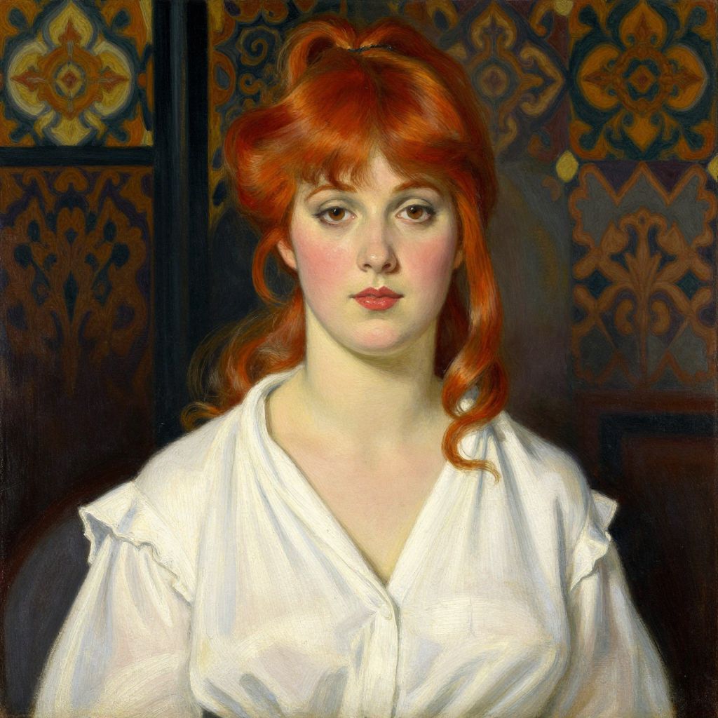 A vintage-style illustration reminiscent of Henri de Toulouse-Lautrec's work, featuring a red-headed woman in a white blouse, rendered with classic oil painting techniques and dramatic lighting against a patterned backdrop.