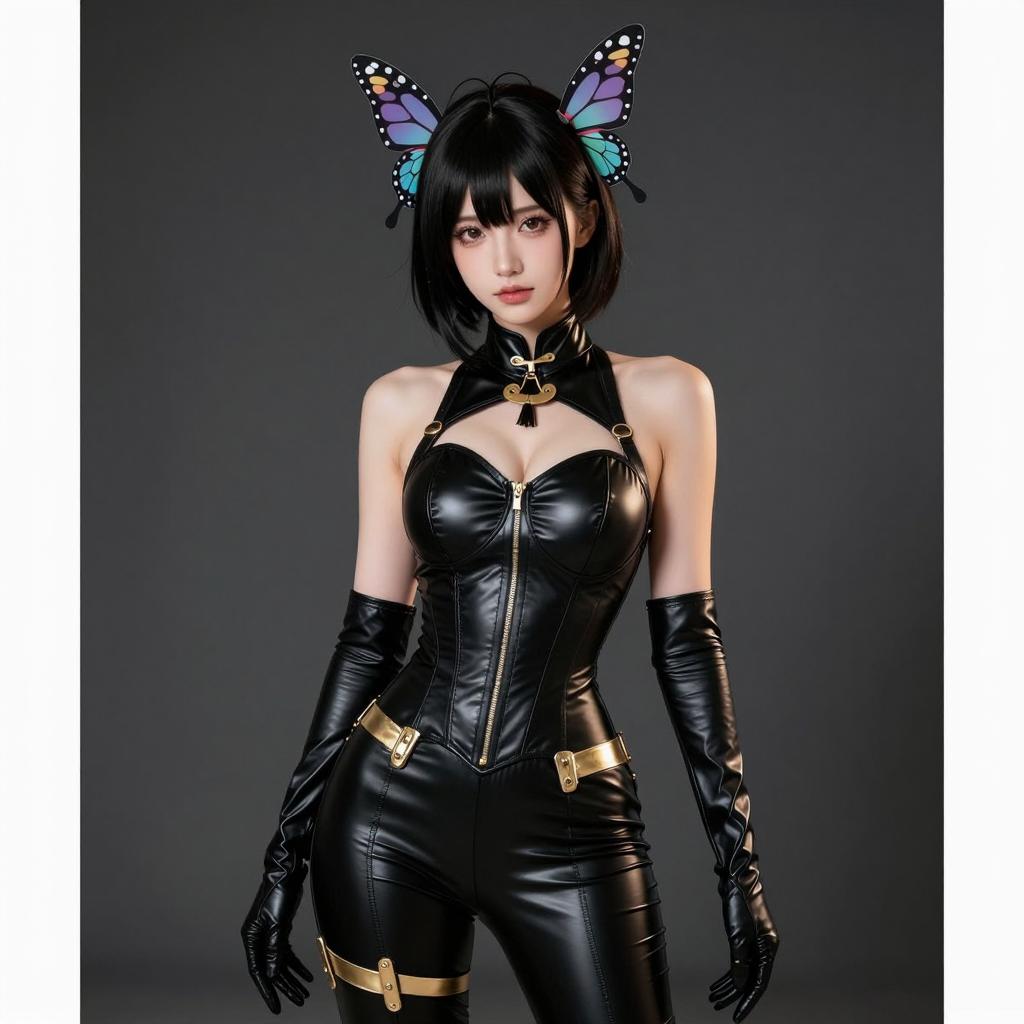 Portrait of a young woman wearing a realistic Secre Swallowtail (Nero) cosplay costume. She has short black hair and is dressed in a tight black leather corset and pants with gold accents, long black gloves, and butterfly wing headpiece. The dark background emphasizes the detailed and glossy texture of the outfit, highlighting the character cosplay.