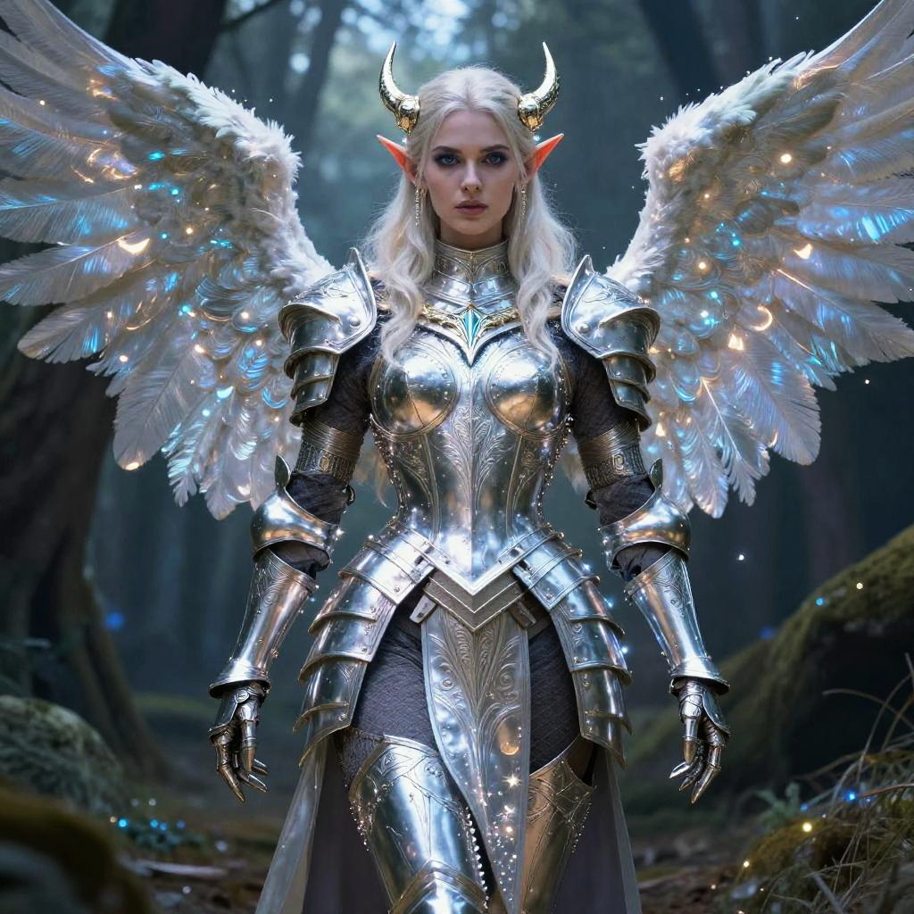 Digital fantasy artwork of a blonde elf woman with white wings, horns, and silver armor, standing in a dark forest.