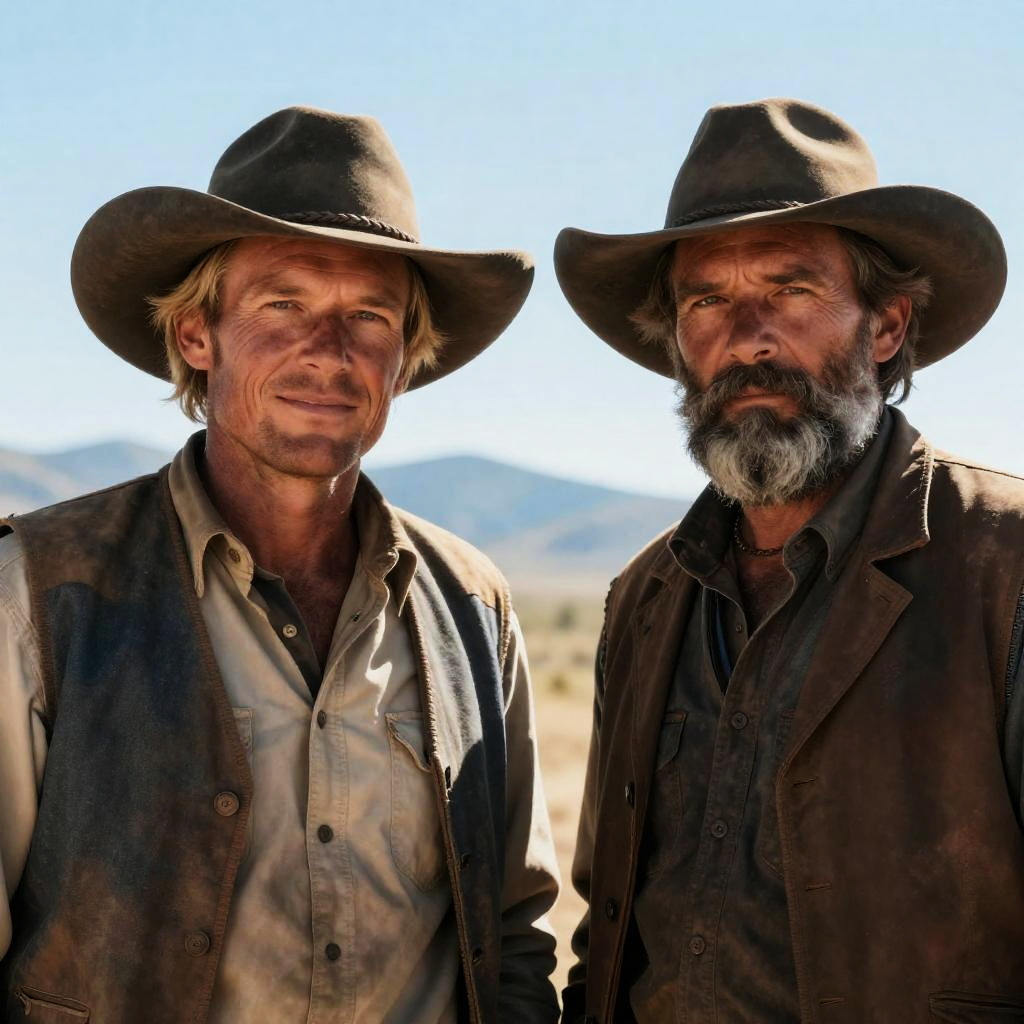 Photograph of two men in cowboy attire walking. African-American man with black hat, brown jacket, smiling, holding reins. White man with grey hat, brown vest, grey shirt, serious expression. Brown horse on left. Wooden buildings in background. Two men in background, blurred.