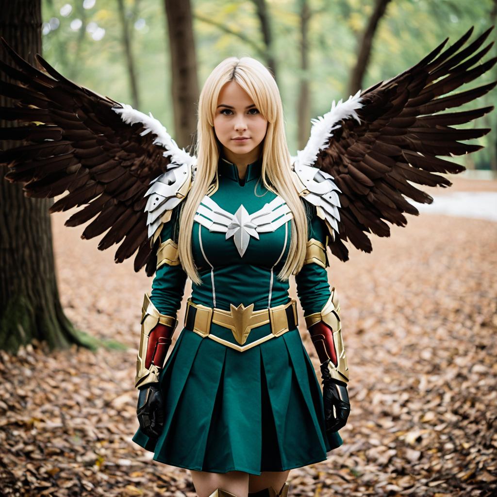 A young woman with long blonde hair wearing a detailed Hawks cosplay from Hero Academia. She is dressed in a green and gold armored costume with black gloves, a pleated skirt, and large brown feathered wings with white accents. The cosplay features intricate armor pieces on the shoulders and forearms. The photo is taken outdoors in a forest setting with fallen leaves on the ground and a blurred tree background. The subject is looking directly at the camera with a calm expression.
