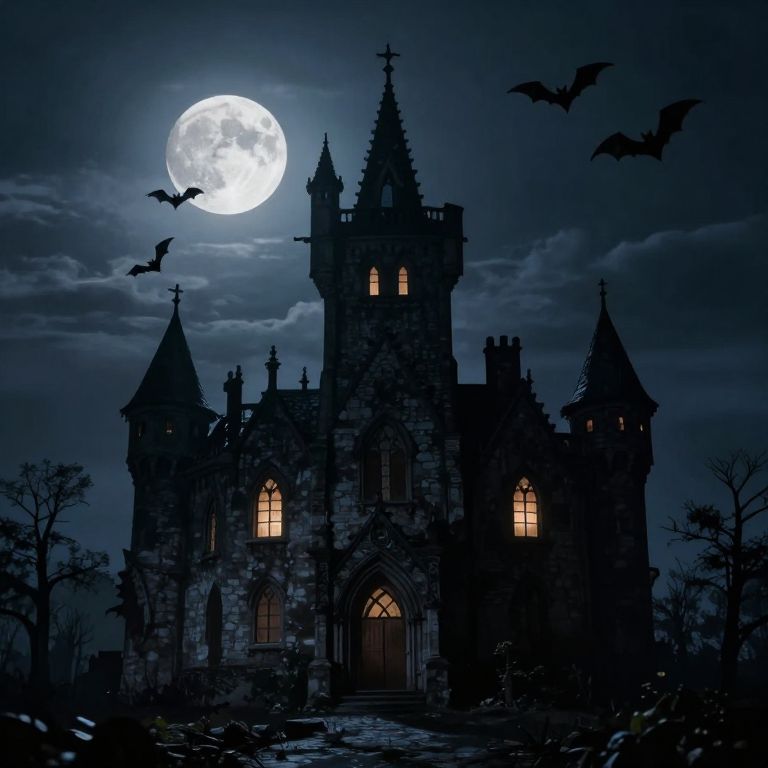 Under the haunting glow of a full moon, a gothic castle stands as a symbol of mystery and foreboding, its flickering lights casting shadows of solitude while bats swirl in the twilight, evoking a sense of eerie anticipation and the timeless dance between light and shadow.