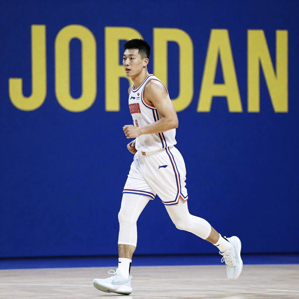 Photograph of a male basketball player in a white and blue uniform, running to the right. Blue ured background. "JORDAN" in yellow and white blocks behind him. Player has short black hair, focused expression. Basketball court surface.