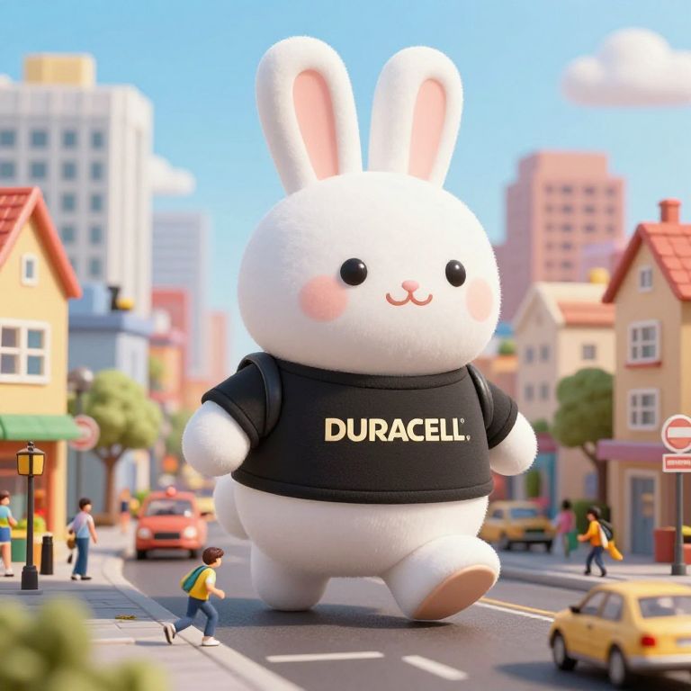 CGI image of a giant, white, cartoon bunny wearing a black "DURACEL" shirt, walking through a colorful, bustling city street