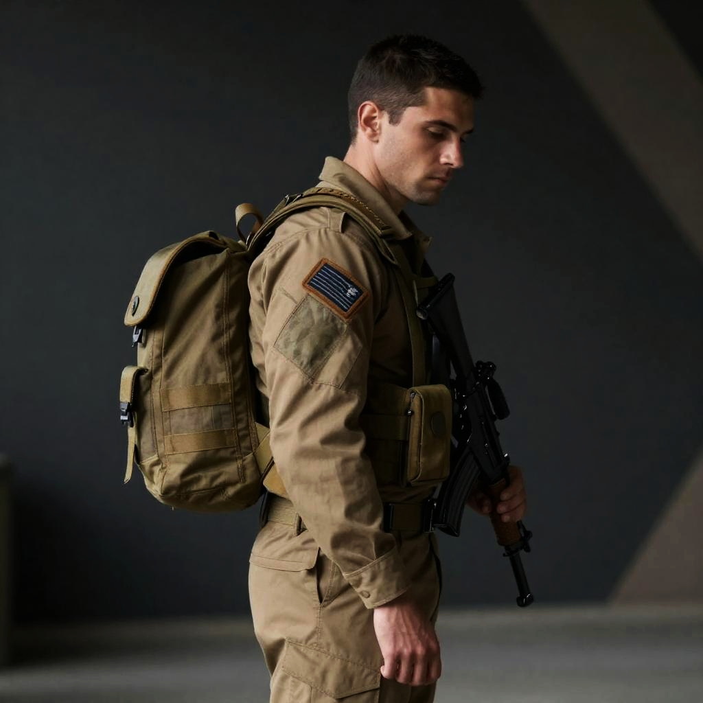Man in tan military uniform with backpack and gun, standing in shadowed, geometric-patterned room. He looks down, serious expression. Dark background with angular light patterns. Backpack has multiple straps. Man positioned center-left.