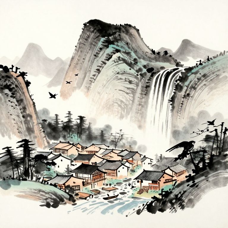 Sumi-e Medieval Village Waterfall