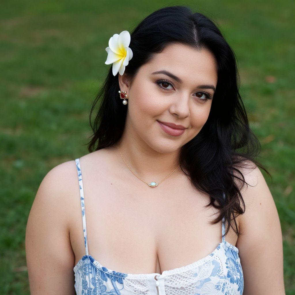 Photograph of a young woman with medium skin tone and dark, wavy hair, wearing a white lace dress with thin straps. She has a white plumeria flower in her hair, small hoop earrings, and a delicate necklace with a small pendant. She has brown eyes, arched eyebrows, and a subtle smile. The background is a blurred, green grassy field. Her dress reveals a modest cleavage. The image has a natural, outdoor setting with soft lighting, emphasizing her relaxed and confident appearance.