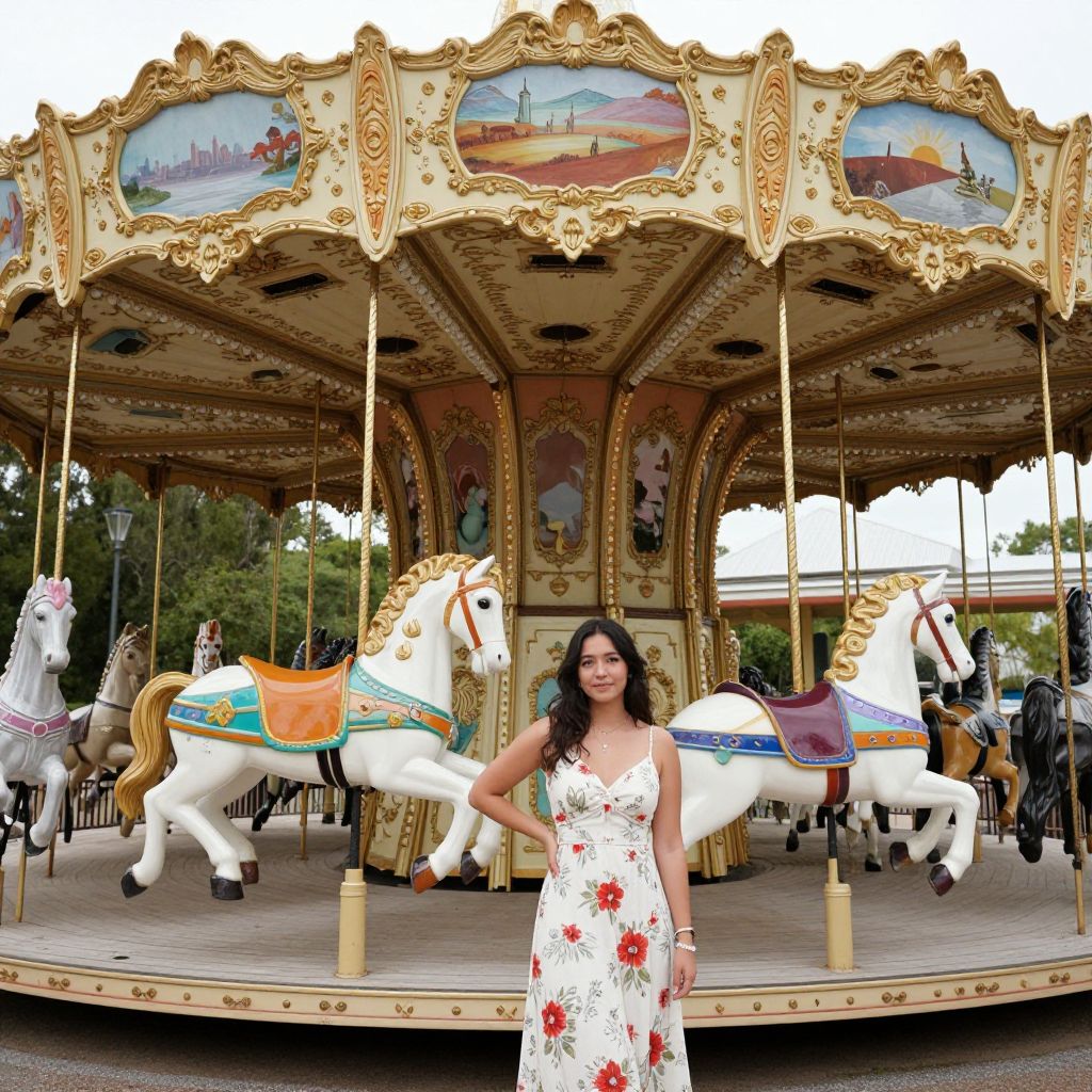 Photograph of a smiling woman in a white floral dress standing in front of an ornate, vintage carousel with colorful horses.