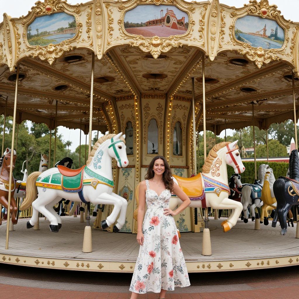 Captivating carousel stands majestically at the San Francisco Zoo, adorned with vibrant horses and ornate details, as a woman in a floral dress poses confidently beside it, capturing the enchanting charm of the scene.