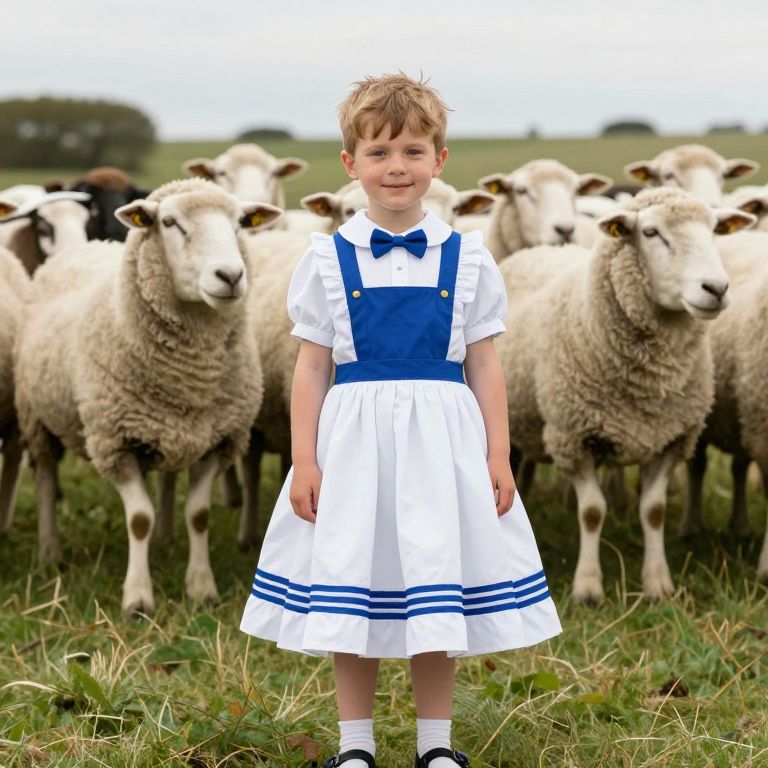 Photograph of a young blonde boy standing in a grassy field, surrounded by a flock of white sheep. He wears a white short-sleeved dress with blue pinafore, blue bow tie, and white socks with black shoes. The dress has blue stripes at the hem. The sheep, with fluffy white wool and black faces, stand closely behind him, looking towards the camera. The background is slightly blurred, showing green grass and a cloudy sky. The boy has a slight smile and stands centered in the frame. The image has a bright, natural color palette.