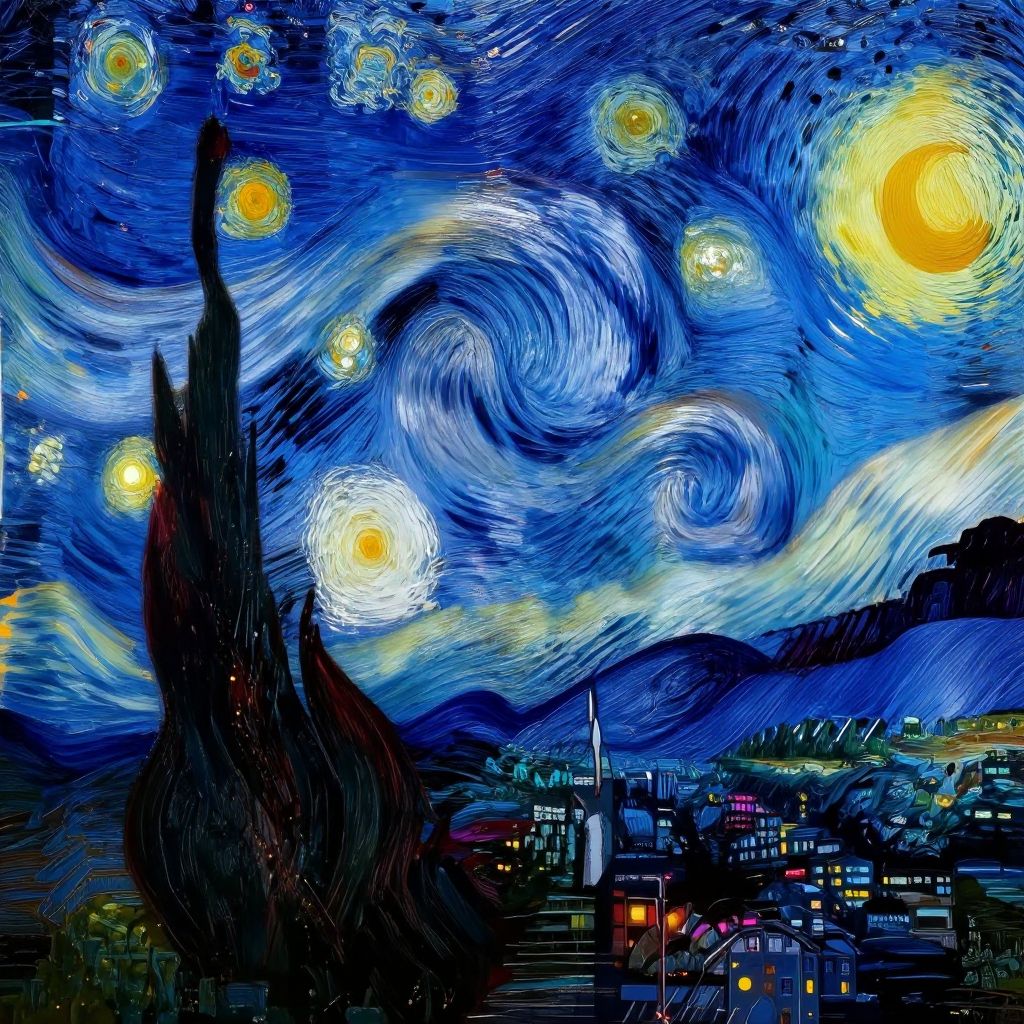 AI image style transfer showcasing a vibrant fusion of Van Gogh's starry night texture over a modern cityscape at dusk, glowing neon lights interwoven with swirling brushstrokes, detailed digital art, high resolution, cinematic lighting