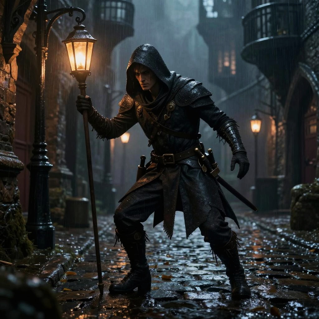 Dark fantasy illustration: Hooded, armored warrior with sword, holding lantern, stands on rainy, cobblestone street, lit by glowing street lamps.