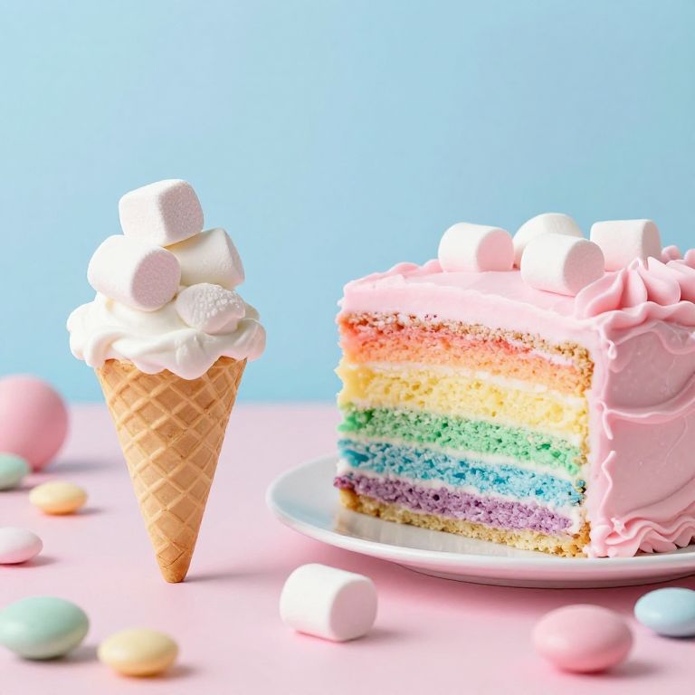 A whimsical tableau where marshmallow ice cream cones stand serenely beside a rainbow-striped cake crowned with fluffy pink frosting, all surrounded by scattered pastel candies, creating a dreamlike confectionery landscape that defies the boundaries of reality.