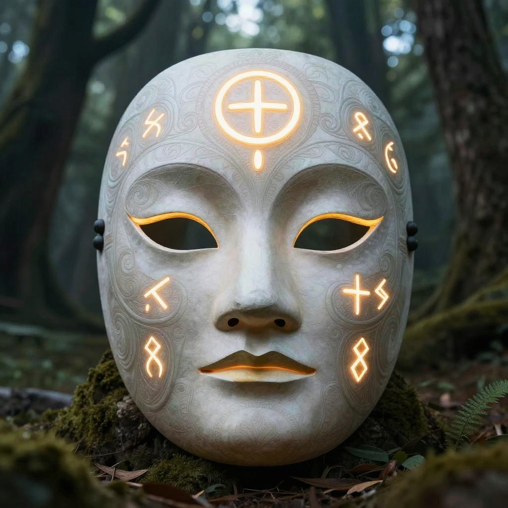 Fantasy mask art featuring intricate designs, glowing runes, and ethereal patterns, set against a mystical forest background with soft magical light filtering through ancient trees.