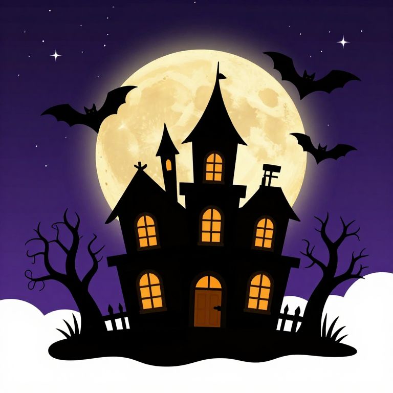This digital illustration features a spooky, black, Gothic-style haunted house with pointed roof peaks and yellow-lit windows, centered against a large, glowing full moon. Silhouetted bats fly in the dark purple, starry night sky. Leafless, twisted trees frame the house, and white, snow-like patches are at the base. The moon's bright, yellow-orange glow illuminates the house's contours, creating a haunting, eerie atmosphere. The overall style is cartoonish with bold, contrasting colors and simple, clean lines.