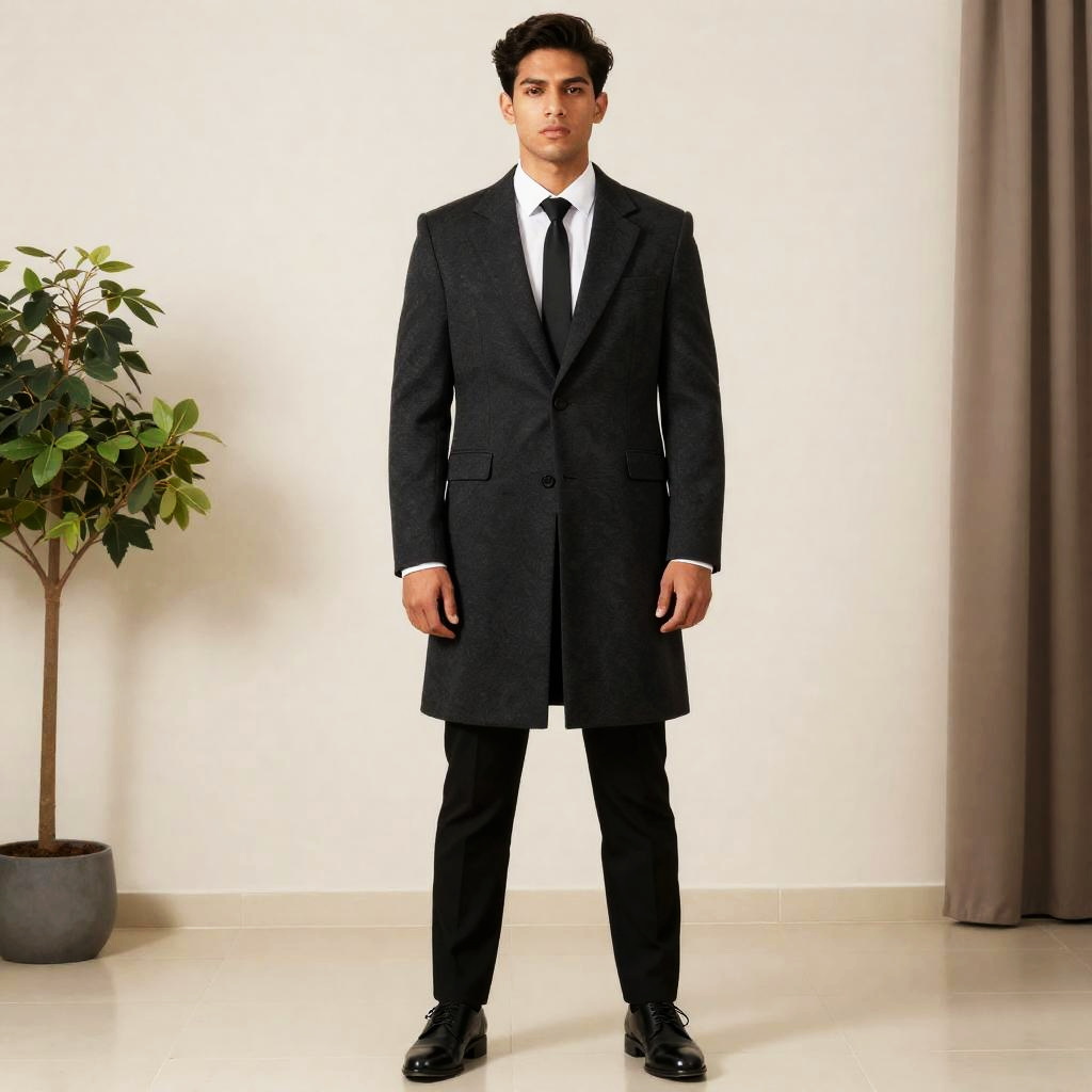 Portrait of a young South Asian man wearing a black formal overcoat, black suit pants, a white dress shirt, and a black tie, standing indoors in a modern hallway with beige tiled flooring. A potted plant and brown curtains are visible in the neutral background.