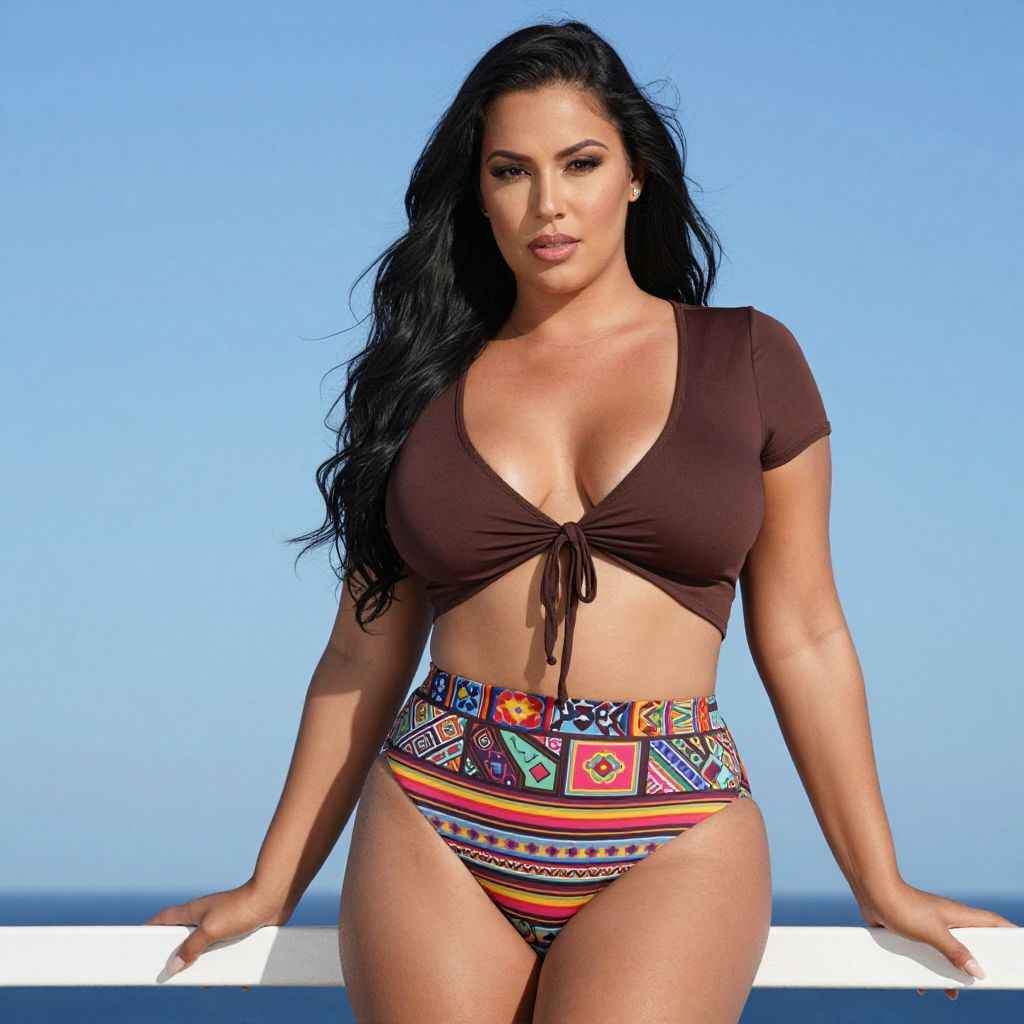Photograph of a confident woman with wavy, dark brown hair, and medium tan skin, standing outdoors by the sea. She's wearing a leopard-print bikini top that accentuates her large breasts, and matching high-waisted bottoms. In the background, there's a restaurant with white tables, people dining, and large umbrellas. The rocky coastline and blue sea are visible. The lighting is bright and sunny.