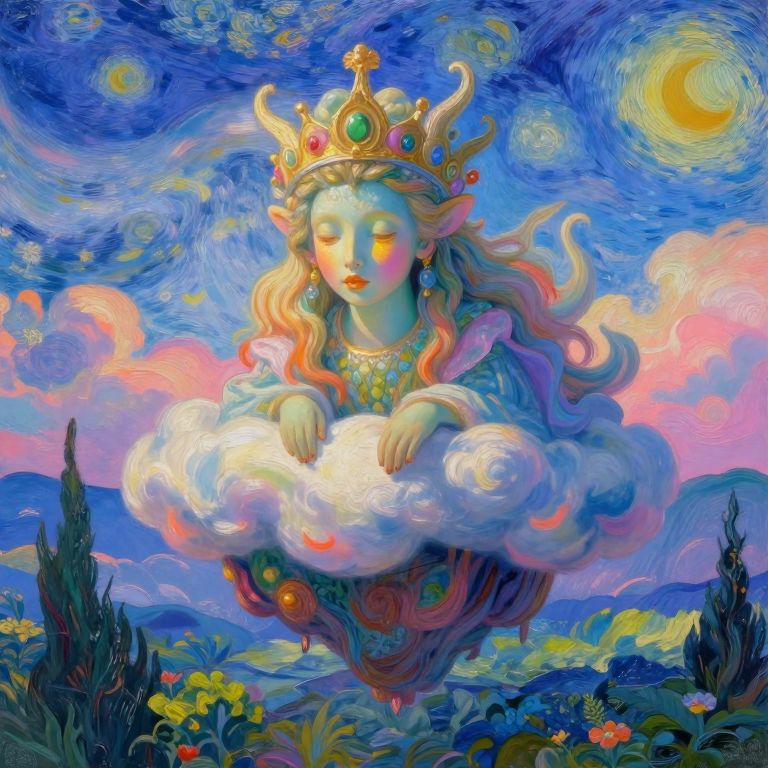 A captivating digital artwork unveils an enchanting scene where a regal being gracefully descends from a vivid sky, reminiscent of surrealism and the vibrant hues of renowned masters. The whimsical landscape below is immersed in colors evoking a Van Gogh-inspired atmosphere as the creature gently alights upon a floating island of clouds. This unique vantage point offers an intimate view into a realm where reality intertwines with imagination, casting an ethereal glow on the lush, dreamlike surroundings. The being's iridescent visage reflects warmth and a wistful expression, beckoning viewers to uncover the mysteries hidden within these otherworldly domains.