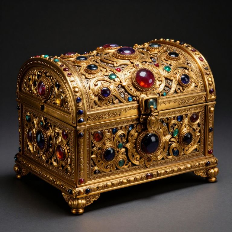 Photograph of an ornate, gold treasure chest adorned with intricate, swirling patterns and embedded with various vibrant gemstones, including large red, blue, green, and purple jewels. The chest has a curved, arched top and a small, central lock. Each side and the edges are embellished with detailed, raised designs and smaller colored stones. The background is a gradient from dark to light, highlighting the chest's luxurious, opulent texture and rich colors. The chest stands on four rounded, gold feet, adding to its grandeur and antique aesthetic.