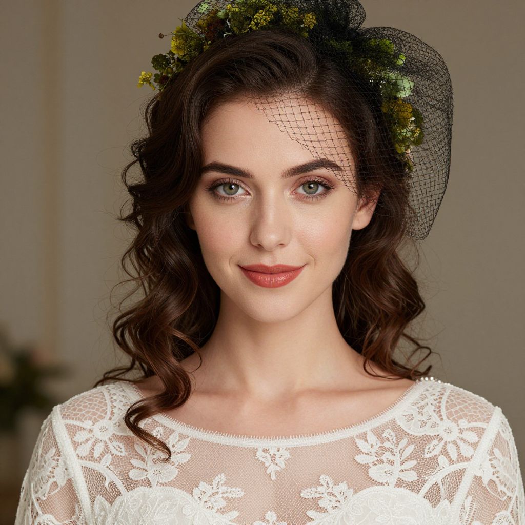 Photograph of a beautiful woman with fair skin and green eyes, wearing a delicate white lace wedding dress with floral patterns. She has dark brown, wavy hair styled in an updo, adorned with a green and yellow floral crown, and a sheer black veil covering her forehead. She's smiling softly with red lipstick. The background is softly blurred, highlighting her as the main focus.