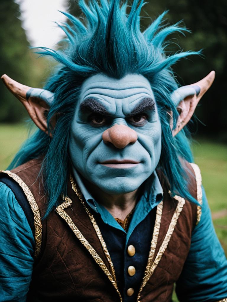 Man in King Gristle Trolls Costume, cinematic realism, whimsical cosplay portrait