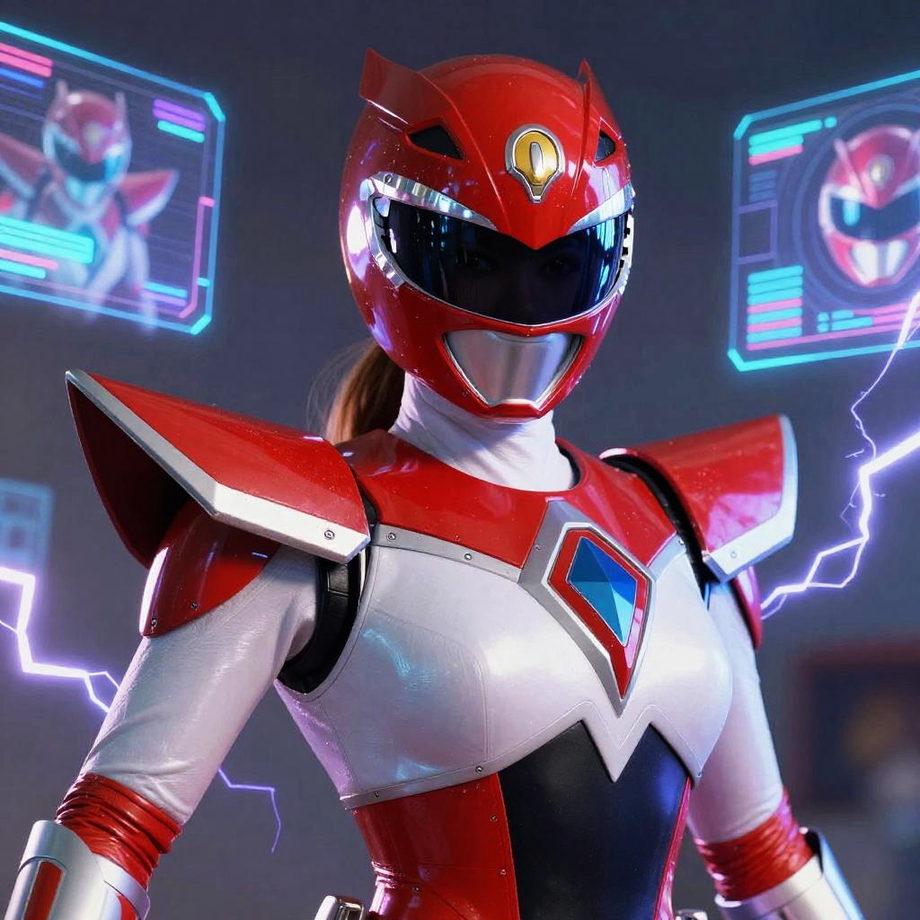 A heroic Natalie Portman Power Ranger, glowing helmet visor, futuristic mech suit with sharp edges and vivid colors, intense expression, surrounded by digital holograms and lightning effects