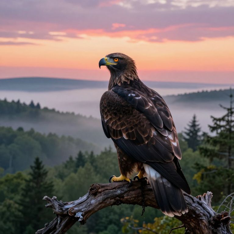 Regal Eagle at Dawn Over Misty Forest