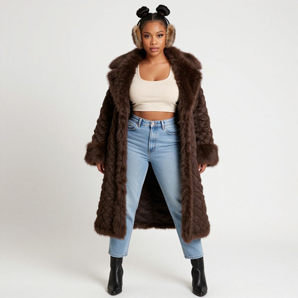 "Woman, contemporary eclectic, textured coat with faux fur collar and cuffs in chocolate brown, quilted detailing, knee-length, underneath a cream-colored cropped tank top, light-wash high-waisted denim jeans, black ankle boots, hair in multiple buns with fur earmuffs, white studio background.. Sexy. Pretty face and beаutiful eyes. Big breasts."