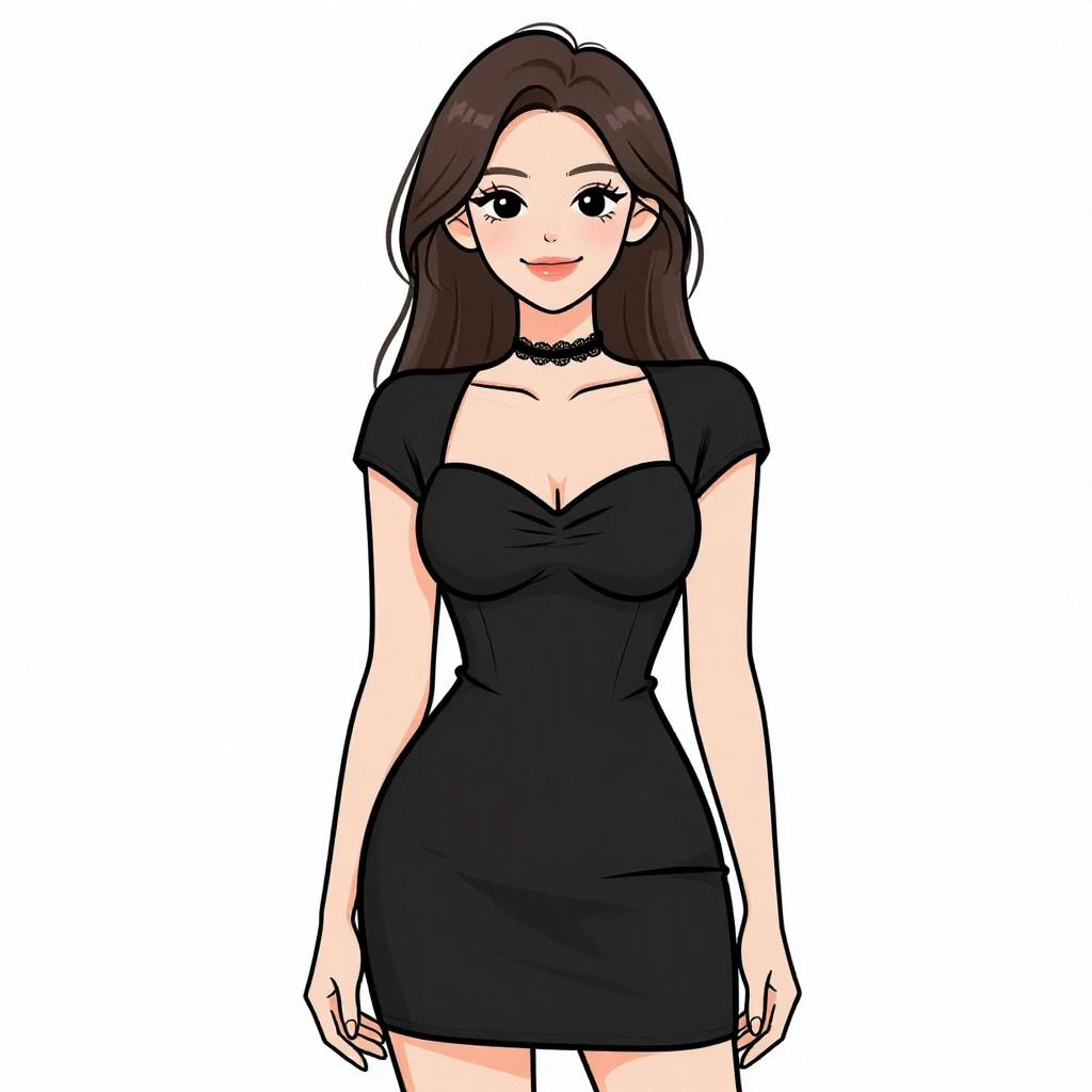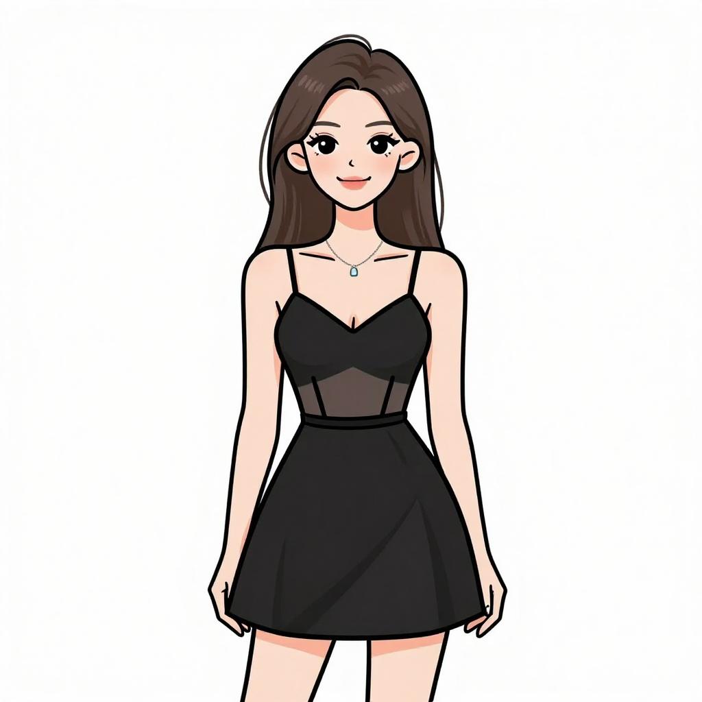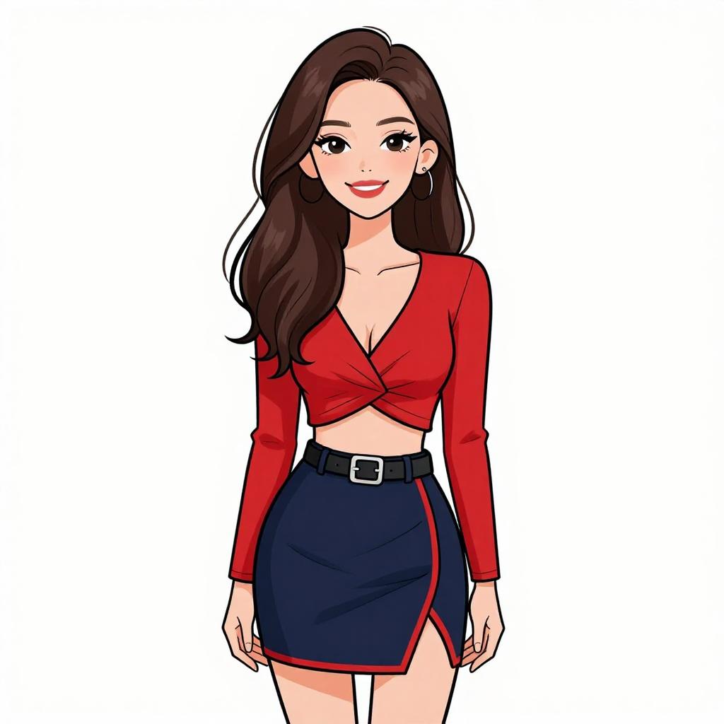 Woman with pretty face and pretty hair. smiling Woman, minimalist chic, black fitted tank top, scoop neckline, thin straps, textured red mini skirt with raised circular patterns, black leather belt with a large square buckle, white studio background. --sref 1467