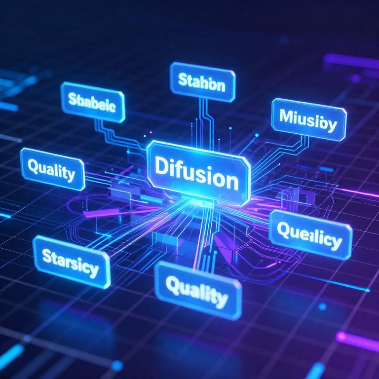 Digital illustration of glowing blue neon labels "Stability," "Quality," "Musivity," "Stability," "Quality," and "Difusion