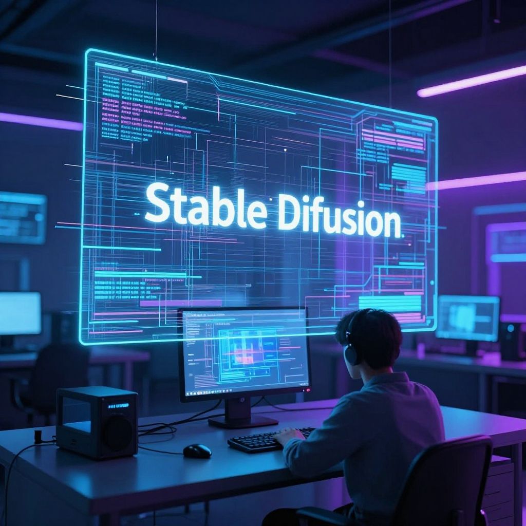 Stable diffusion quality tags visualized as glowing digital labels floating above a futuristic AI interface, cybernetic grid backdrop, vibrant neon blues and purples, intricate data streams connecting tags, sharp focus, high-tech ambiance