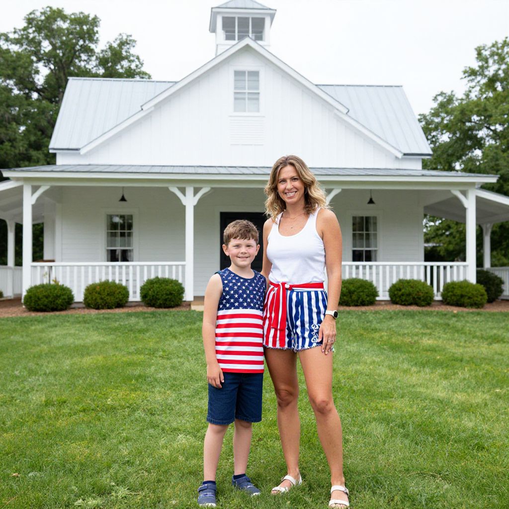 Woman and child posing outdoors in front of a white farmhouse with green lawn and shrubs, both wearing patriotic-themed clothing, suggesting a Fourth of July celebration at The American Adventure Pavilion.