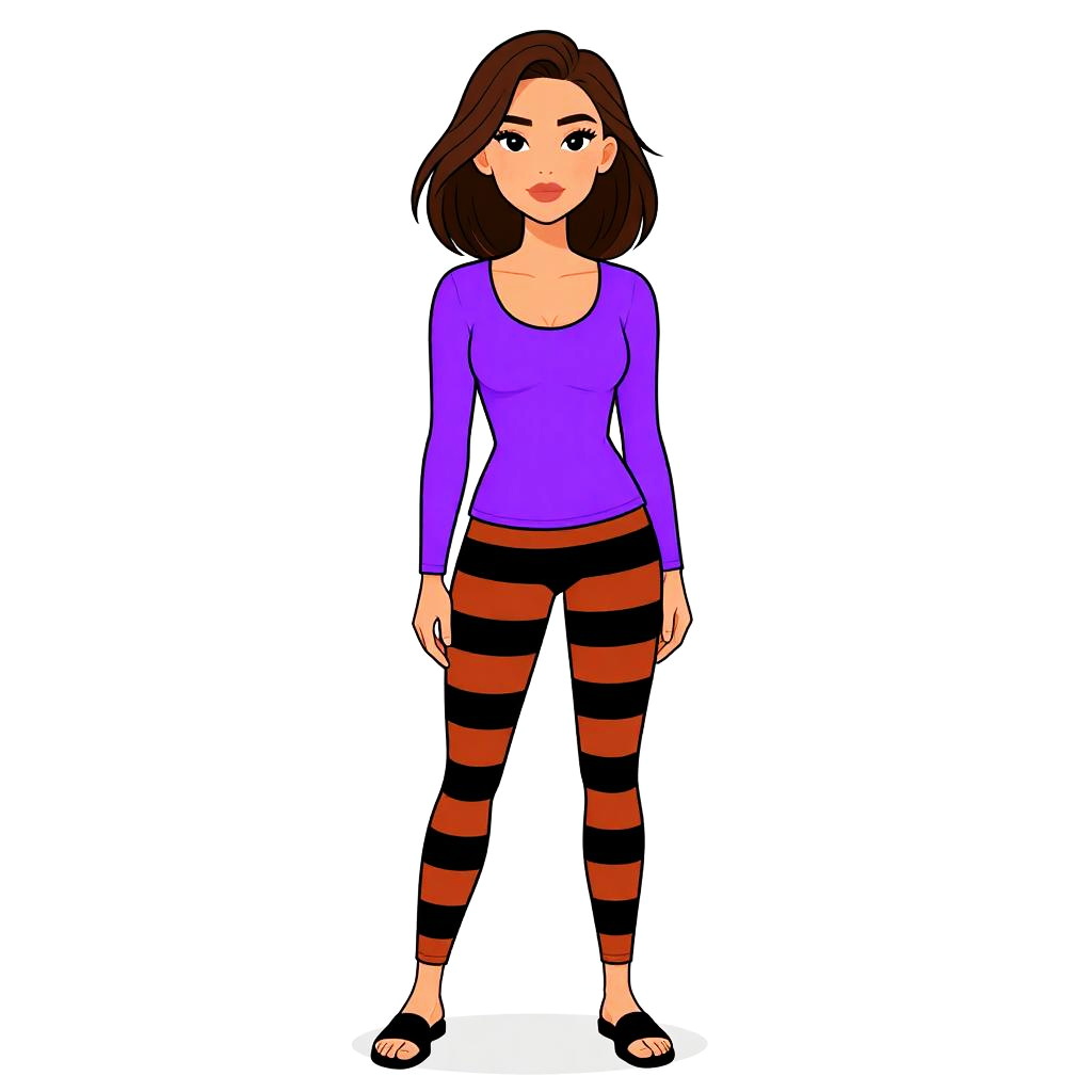 Woman with pretty face and pretty hair. Woman, casual street style, fitted long-sleeve top with scoop neckline, coordinated leggings, both with black and burnt orange horizontal stripes, cropped at the ankle, paired with black open-toe flat sandals, white studio background. --sref 1467