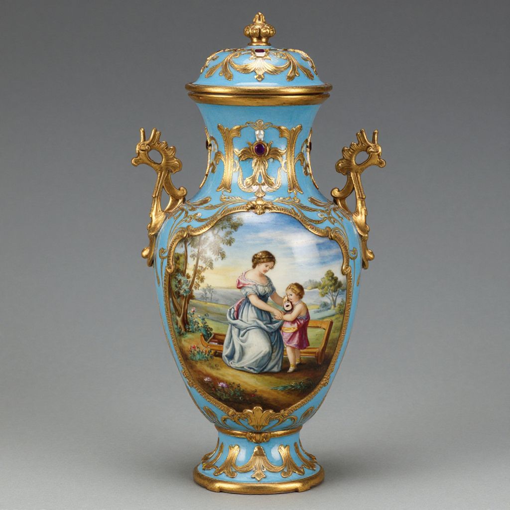 Ornate blue and gold porcelain vase with intricate gold detailing, featuring a painted scene of a woman in a blue dress and a child in pink standing