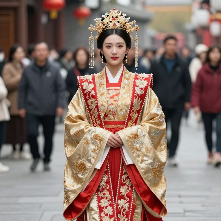 Female wearing a traditional Chinese dress with gold and red accents. She is wearing a headpiece with a crown on her head, and is walking down the street. In the background, there are other people walking on the street, and some are standing.