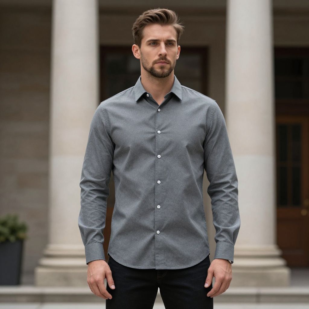 Shirt Clothes Man Costume, man in a gray shirt standing in front of a building