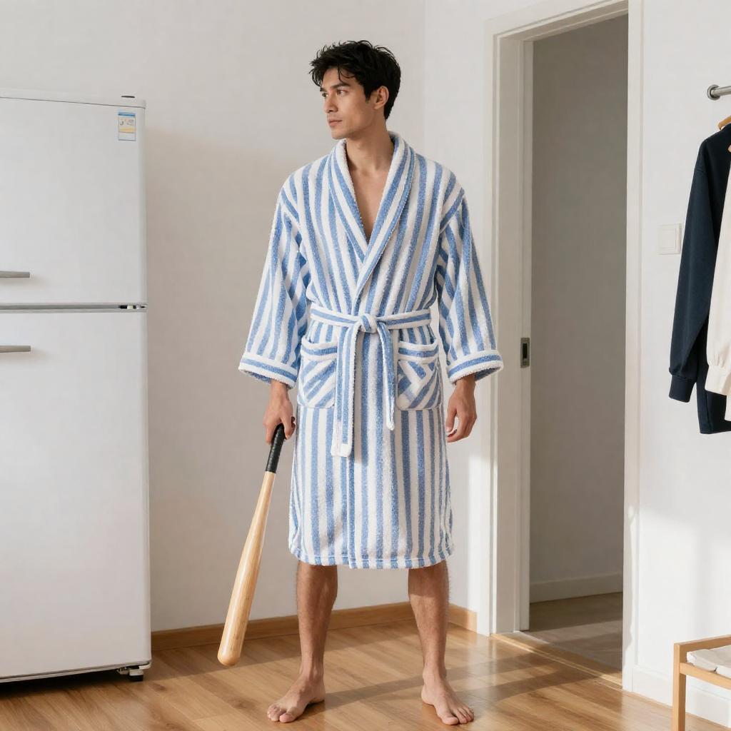 Man in Bathrobe Holding Baseball Bat