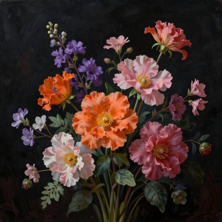 The image presents a painterly still life arrangement of vibrant flowers against a dark, almost black background, creating a striking contrast. The composition features a variety of flowers, including large, intricately detailed blossoms in shades of orange, pink, and purple, with delicate petals and pronounced stamens. Smaller, more delicate flowers and buds are interspersed throughout, adding depth and texture to the scene. The flowers are arranged in a somewhat loose, naturalistic manner, with some flowers appearing to be in the foreground and others in the background, creating a sense of depth. The leaves and stems are lush and green, providing a fresh, vibrant counterpoint to the dark background. The overall composition is balanced, with the flowers and foliage distributed evenly across the frame, and the interplay of colors and textures enhances the visual appeal of the image.