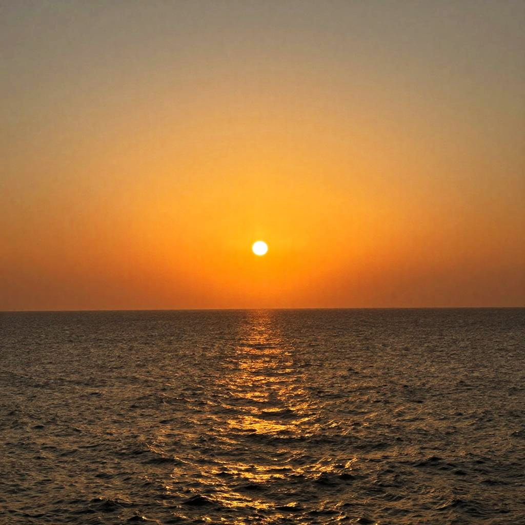 Photograph of a stunning sunset over the ocean. The sun is low on the horizon, casting a vibrant orange glow across the sky and reflecting a shimmering golden path on the dark, rippling water below. The sky transitions from bright orange near the sun to a deeper, darker shade as it moves upward. The overall scene is rich in warm, contrasting colors and has a peaceful, calming vibe.