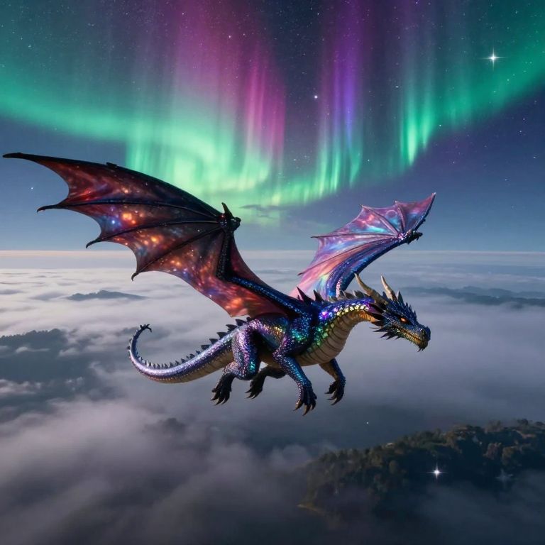 A majestic dragon, its scales shimmering with an iridescent palette reminiscent of swirling galaxies and cosmic dust, gracefully glides over a misty landscape. From an otherworldly aerial vantage point, witness the dragon's expansive wingspan against a vibrant backdrop of a celestial aurora, where strokes of luminescent paint blend seamlessly into the night sky. This scene captures both the awe-inspiring grandeur and dreamlike beauty of this fantastical creature against a cosmic canvas, evoking a sense of wonder and enchantment in equal measure.