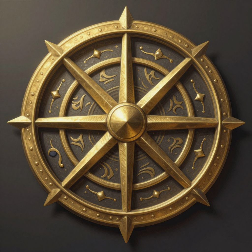 Photograph of a golden, circular, medieval-style compass rose with eight pointed star-like arms converging at a central, dome-shaped hub. The background is a solid, dark gray or black surface, enhancing the gold's metallic sheen. The outer rim is adorned with small, evenly spaced, raised dots. Inside the arms, there are intricate, swirling, ornate patterns, adding a decorative element. The golden texture is smooth yet has subtle, engraved details, giving it a rich, antique appearance. The image has a high contrast, highlighting the shimmering gold against the dark background.