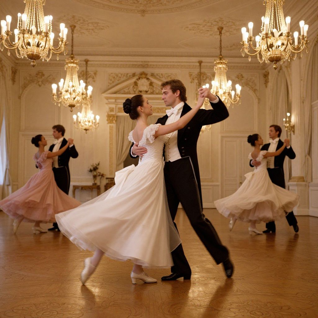 Waltzing couple in elegant 19th-century ballroom, flowing gowns and tuxedos, ornate chandeliers casting warm light, graceful movements capturing the essence of classical dance, intricate wood floors reflecting their steps, romantic and timeless atmosphere.