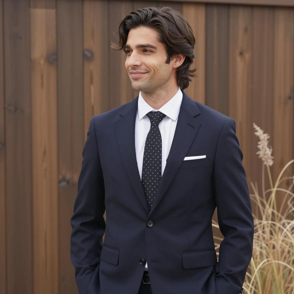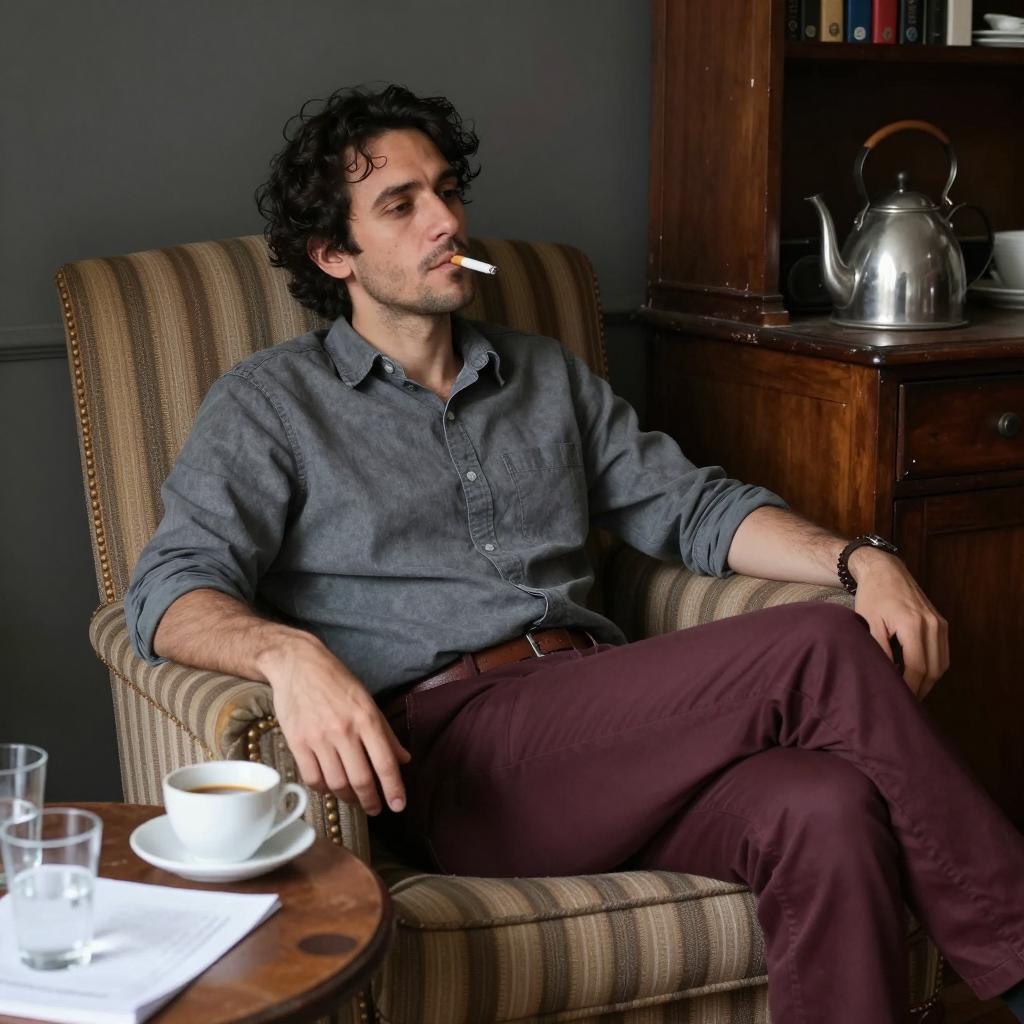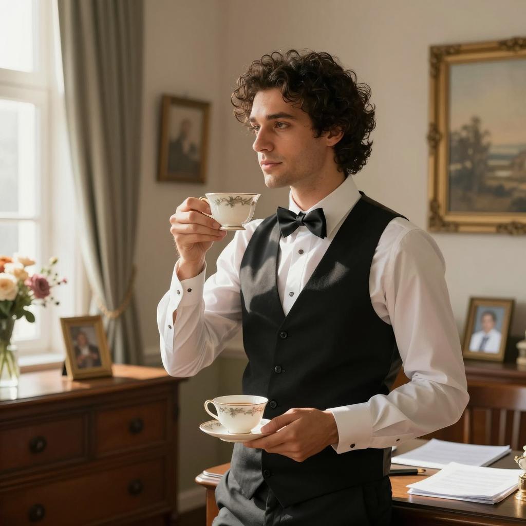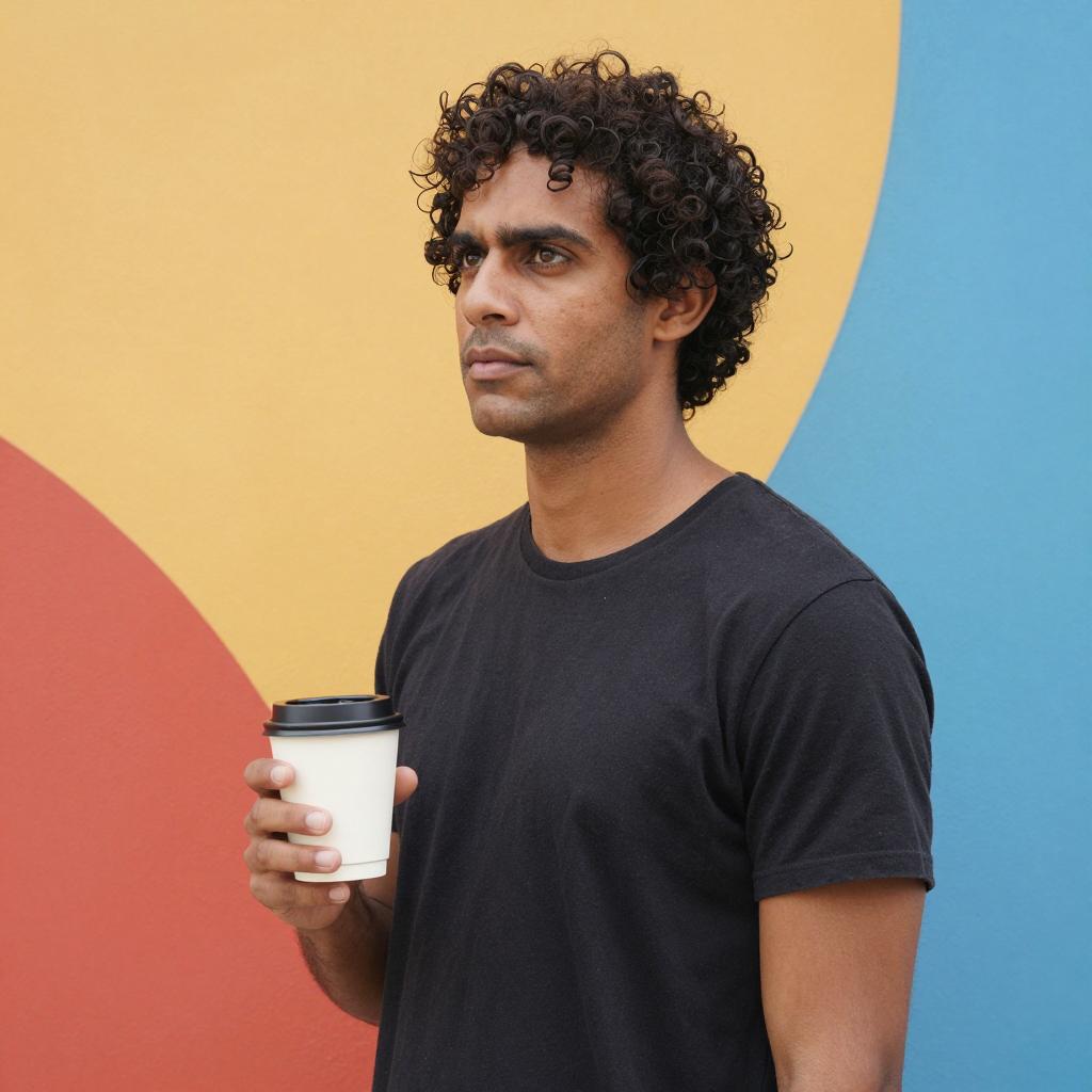 Photograph of a man with dark, curly hair, wearing a black suit and white dress shirt, drinking from a red and white striped paper cup. He looks slightly downward with a focused expression. Background includes a brick wall, window, and a ladder. Green vines hang on the wall.