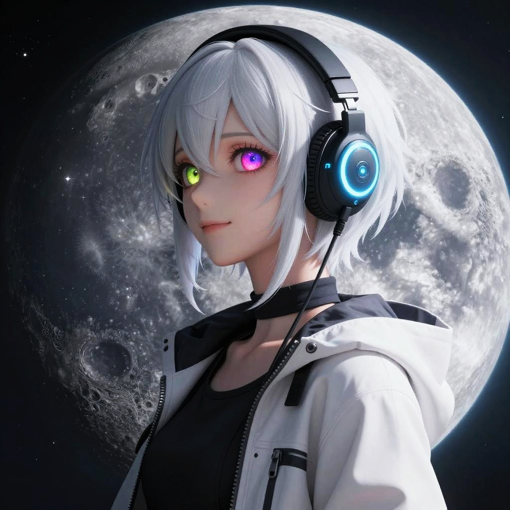 Sle, mksks style, detailed background, anime, (on the moon, space, looking back into earth), white hair, black tank top, volumetric lighting, white jacket, glowing headphone, cyberpunk, futuristic, multi-color eyes, detailed eyes, hyper detailed, light smile, highly detailed, beautiful, small details, ultra detailed, best quality, intricate, hyperrealism, sharp, digital illustration, detailed, realism, 4k, 8k, trending on artstation, good anatomy, beautiful lighting, award-winning, realistic shadows, realistic lighting, raytracing, intricate details, moody, rule of thirds