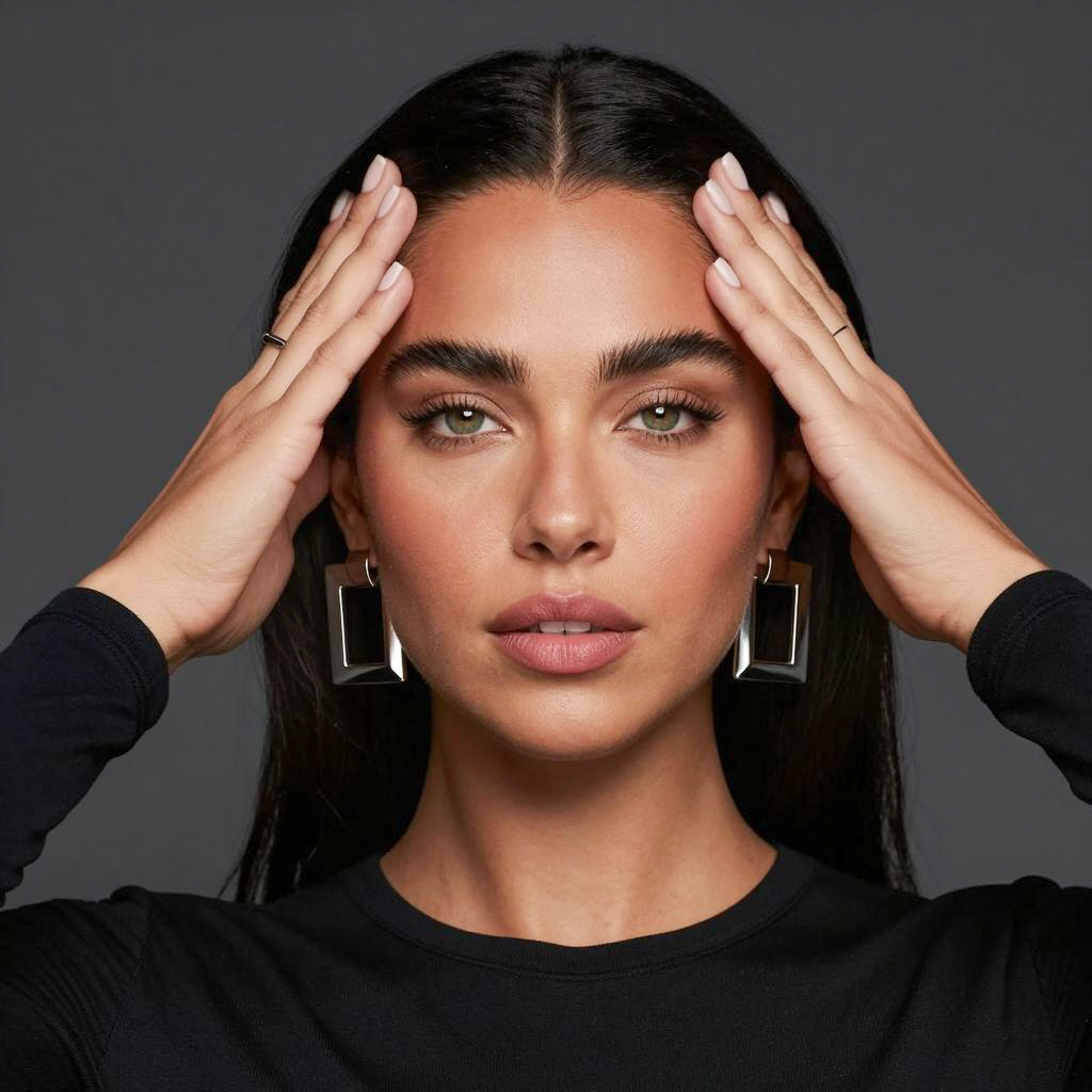 Photograph of a woman with light brown skin, black hair, and green eyes. She has full eyebrows, subtle makeup, and pink lipstick. She wears a black long-sleeve top and large, square, silver earrings. Her hands are on her forehead, fingers spread. She has a ring on her right index finger. Her expression is neutral. The background is dark gray.